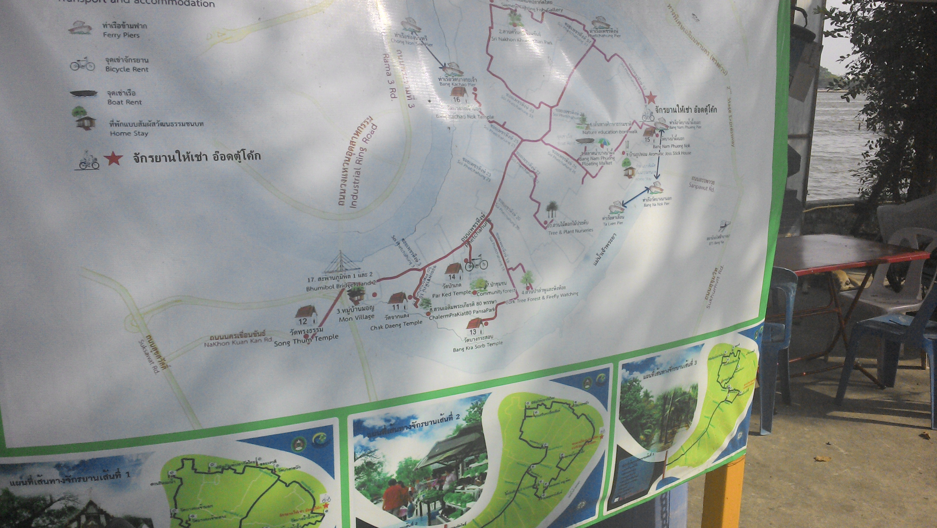 Jeder, der dem Hauser-, Menschen- und Verkehrschaos von Bangkok fuer einen Tag entkommen will, dem sei das Ganze sehr empfohlen. Man muss allerdings etwas unerschrocken sein und am besten eine Karte der Umgebung dabei haben um eventuellen Fahrern zu erklaeren wo man hin will. Ausserdem ist ein wenig Orientierungssinn oder die Unerschrockenheit einfach mal drauf los zu radeln und ggf nach dem Weg zu fragen, ebenfalls sehr hilfreich. Als ich am Ende wieder zurueck wollte, fuhr ich erst falsch, fand dann aber im Endeffekt doch den Weg. Geht man so wie ich alleine, sollte man auf jeden Fall die Ruhe besitzen, nicht gleich in Panik zu verfallen wenn man nicht mehr genau weiss, wo man ist.