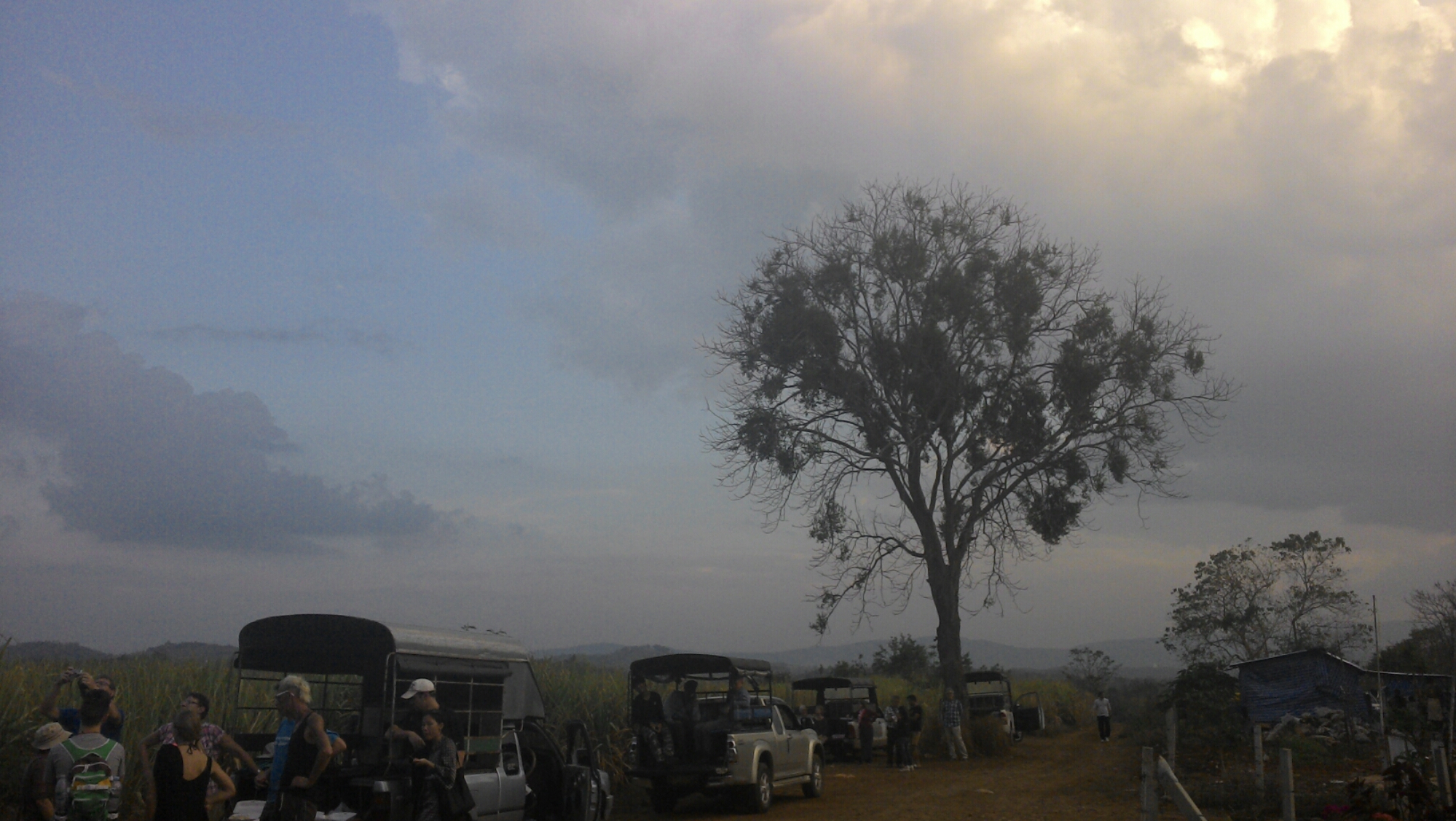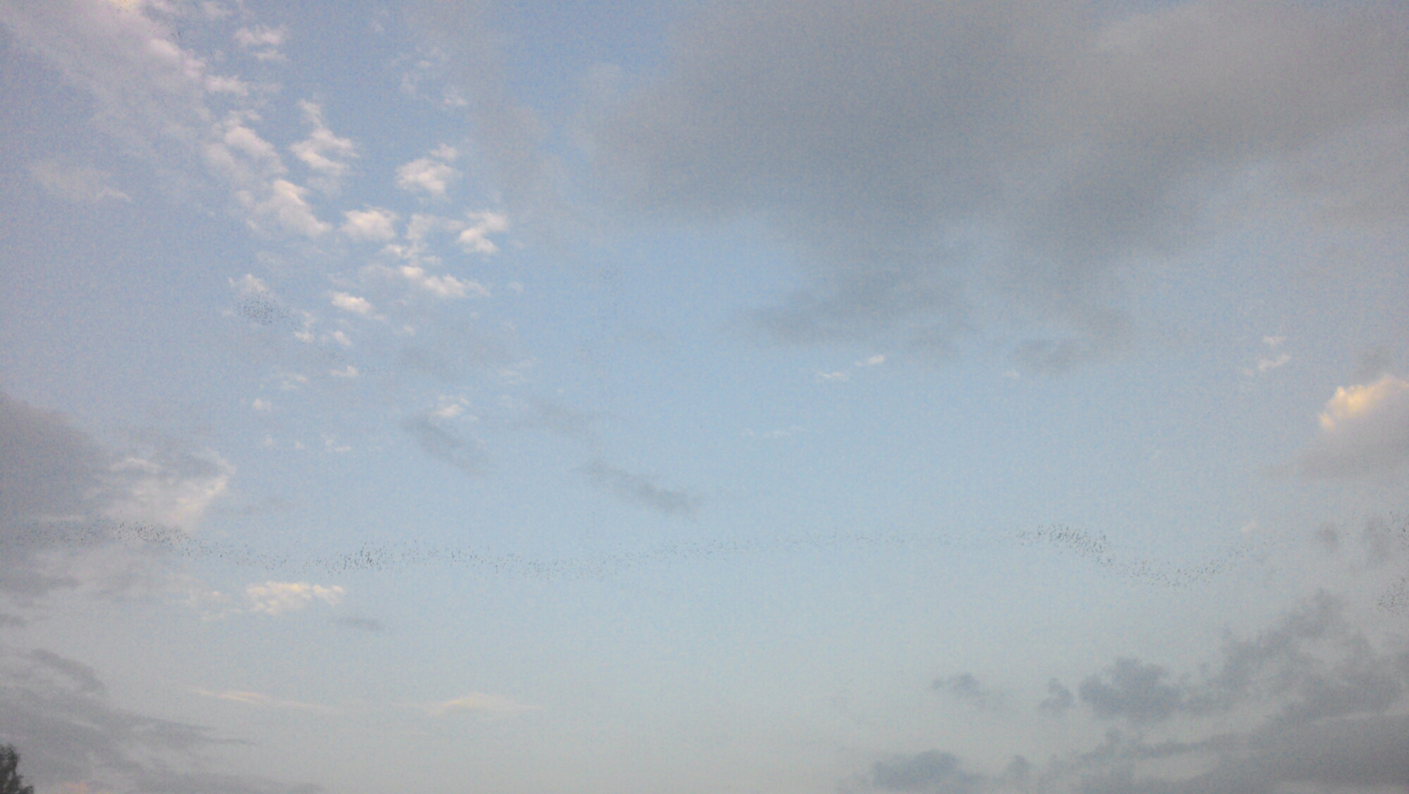Als letzter Punkt des Tages ging es dann den Berg runter vor die Höhle. Pünktlich zu Sonnenuntergang begann dann das Spektakel – die Fledermäuse schwärmten aus. Aber nicht alle auf einmal, nein, geordnet quasi in einer langen Band an Fledermäusen. Sehr schwer zu beschreiben, aber ein wirklich toller Anblick. 2 Millionen leben in der Höhle, so dass man ca. 30 min zusehen kann, wie sie ausströmen. Wunderbar (sollte eigentlich auf dem zweiten Bild zu erkennen sein…).
