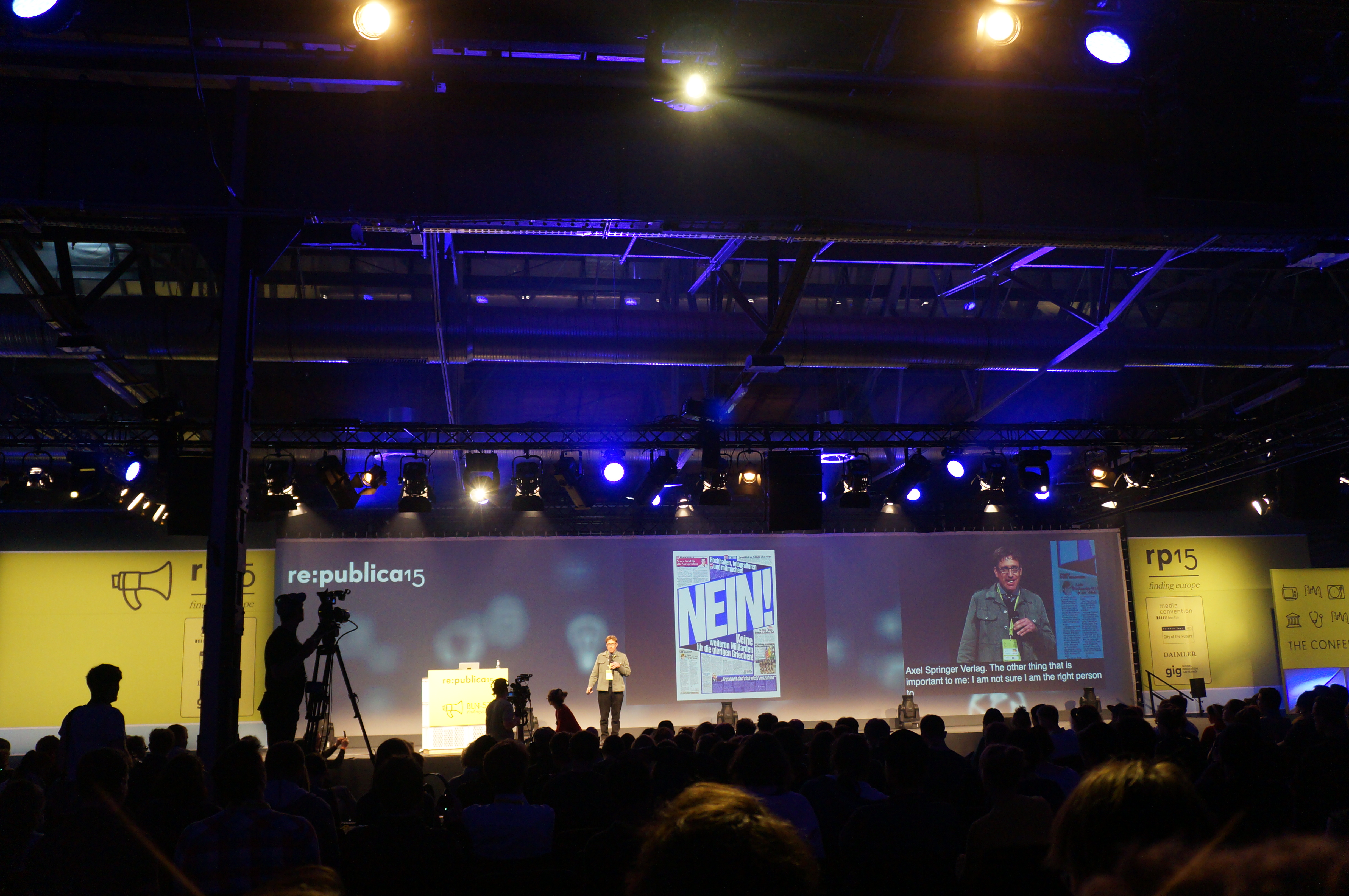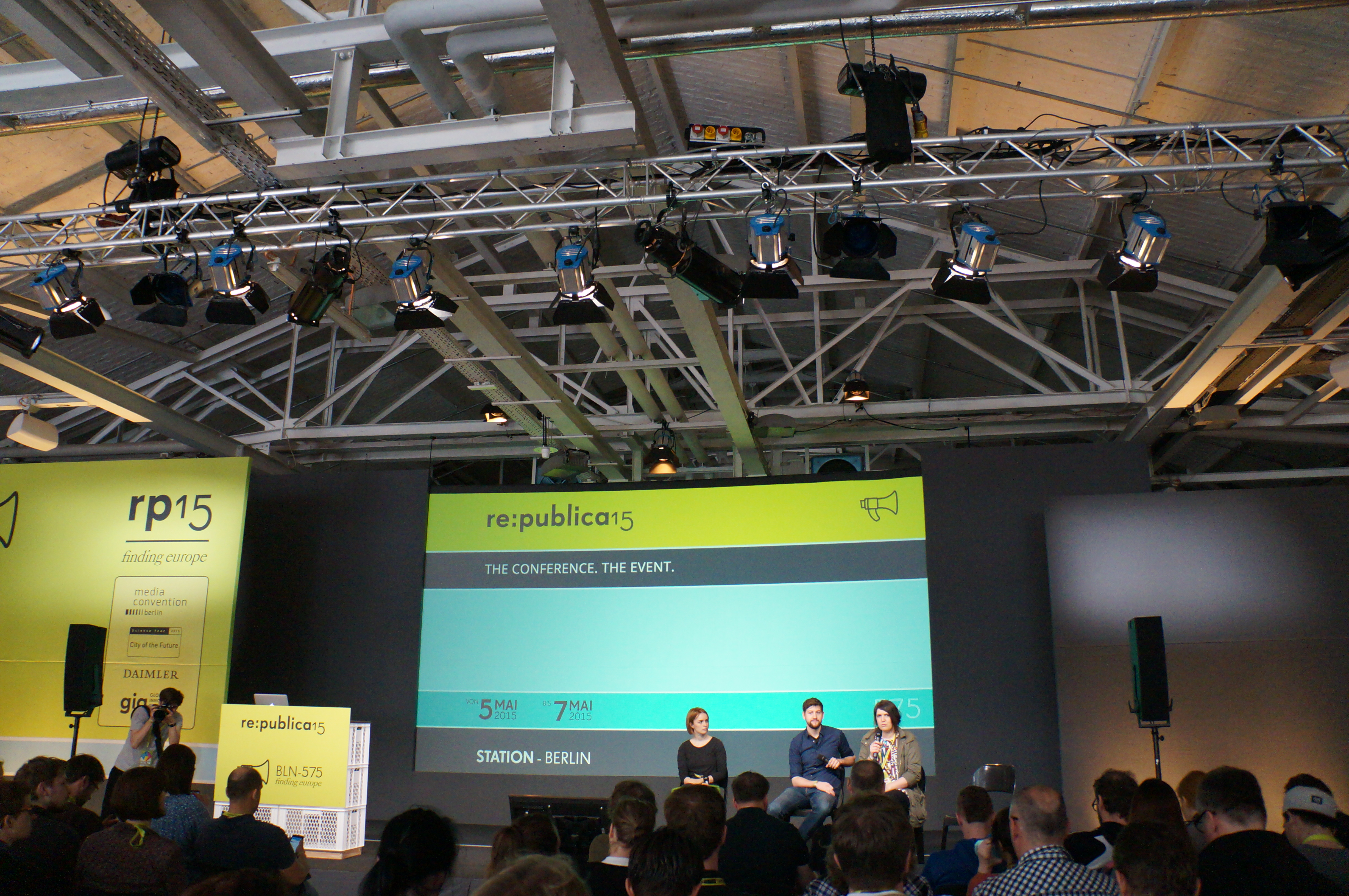 Morgens dann in Berlin angekommen ging es gleich auf zur re:publica, wo auch schon die ersten Sessions anfingen. Ich war etwas müde und damit relativ überfordert von Programm und der Veranstaltung an sich, was vielleicht auch daran lag, dass ich mir eigentlich den Ablauf im Zug nochmal in Ruhe anschauen wollte, was im Bus nicht so recht gelingen wollte. Trotzdem sah ich einige interessante Sessions, unter anderem das Opening-Event, ein Panel zur Flüchtlingsproblematik, eine Diskussion zu informeller Architekturplanung und sozialer Architektur und ein Talk zu Ethik in sozialen Medien. An diesem Tag war ich sehr schnell sehr platt und bin bald mal zu meiner Unterkunft, die dank Bahnstreik um einiges schwerer zu erreichen war.