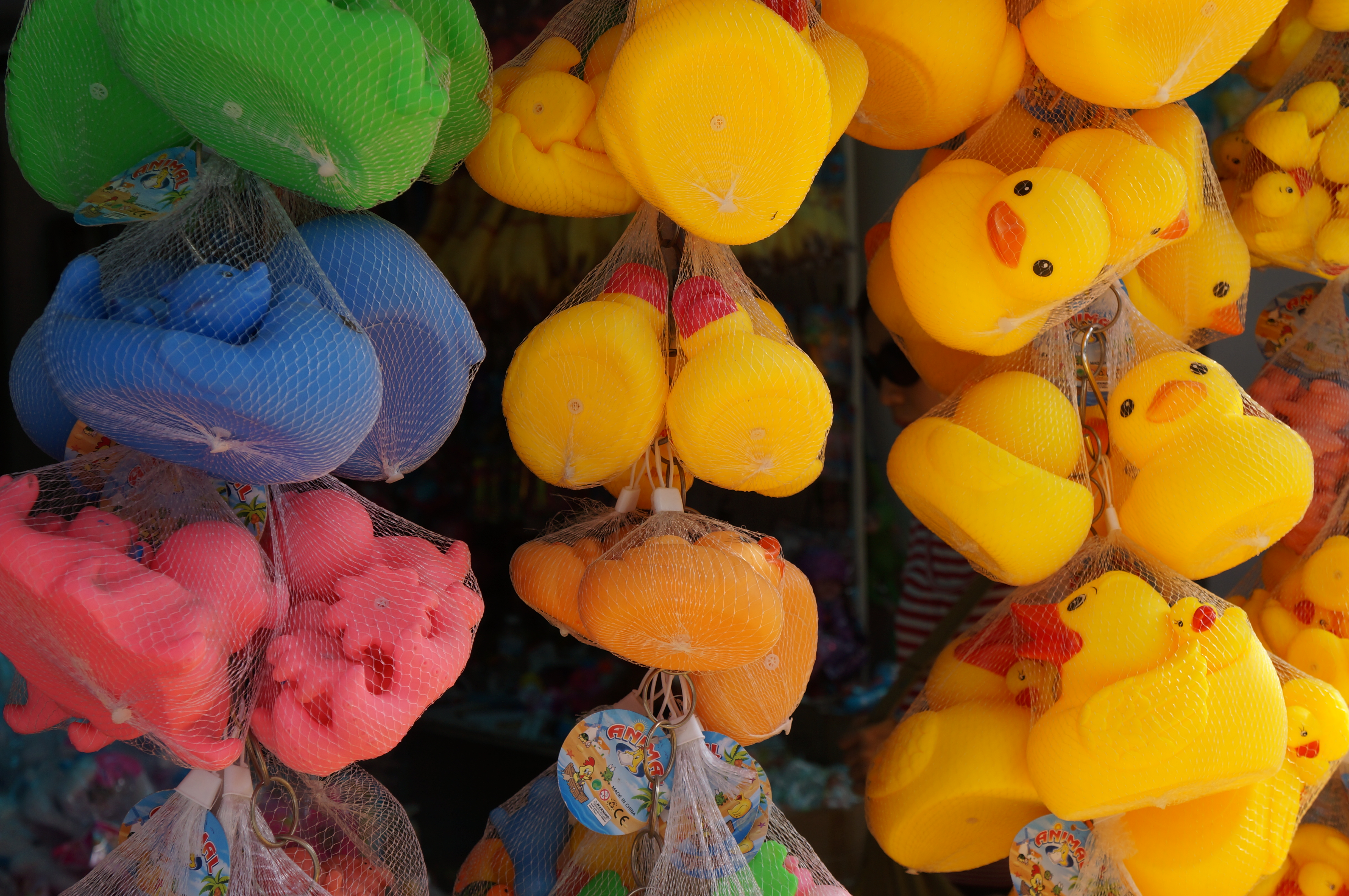 Neben Feierlichkeiten gibt es in Chinatown aber natürlich auch jede Menge Krims- und vor allem Plastikkrams. Und ein Laden hatte dann eben vor seiner Tür lauter Quietscheenten. Das sieht nicht nur gut auf Fotos aus, sondern bei den Enten musste ich sofort an eine Freundin von mir denken, die totaler Quietscheenten-Fan ist und die Mitte Mai heiraten sollte. Die Hochzeit ist schon rum, aber ich wusste damals schon, dass das ihre Hochzeitskarte werden würde. Das geschah dann auch tatsächlich und ich druckte das Bild auf ihre Glückwunschkarte – auf ihrer Hochzeitstorte waren übrigens die Braut und der Bräutigam als Quietscheente.
