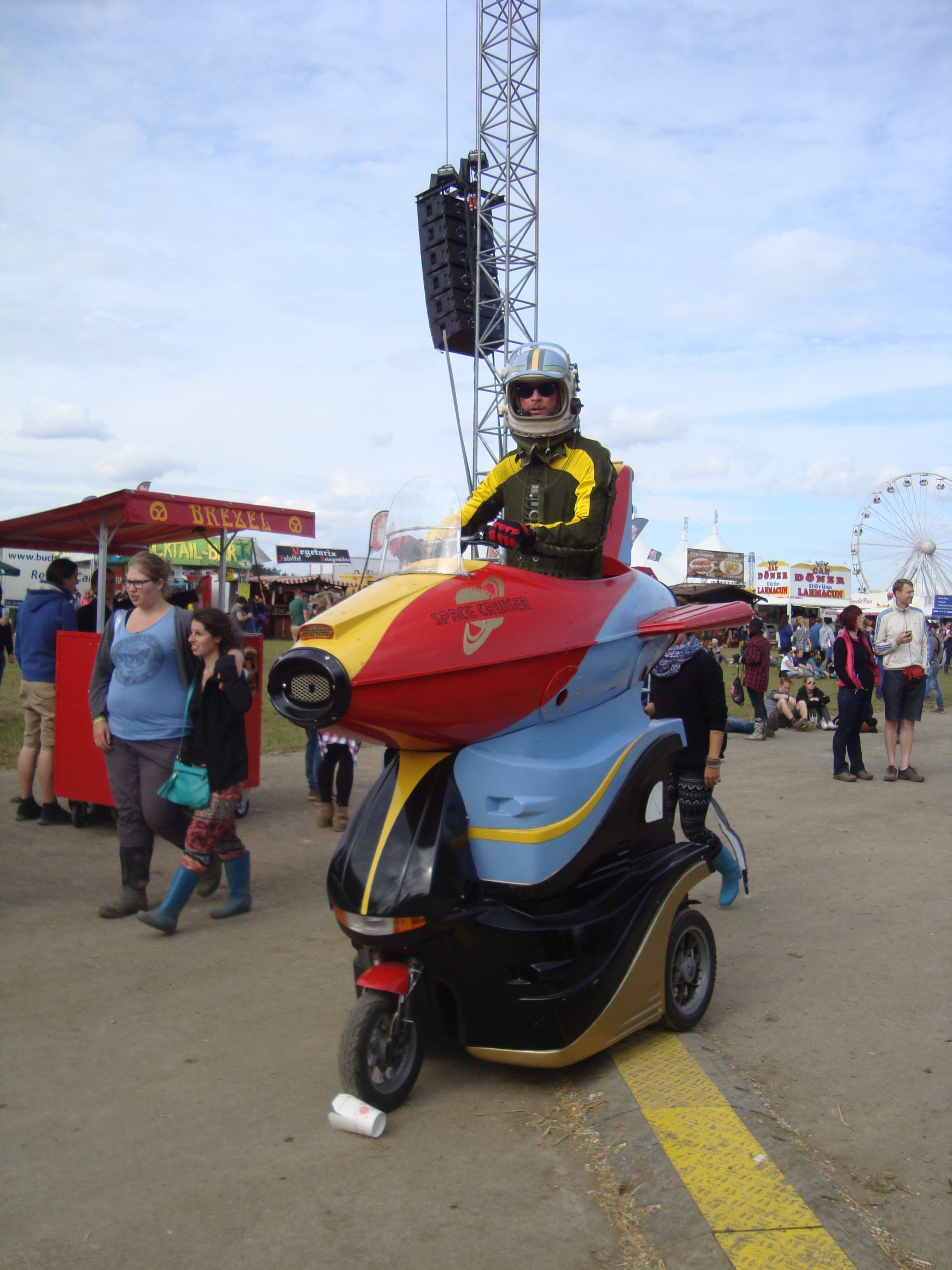 Dann ging es auch schon weiter mit labrassbanda (wenig verstanden, aber die Musik geht in die Beine. Boarisch, olé!), Jupiter Jones (ich musste mir den „neuen“ Sänger mal ansehen. Für gut befunden), NOFX (alte Punkband, der Sänger trug ein Kleid und auch sonst war es sehr anarchisch), Parov Stelar Band (gute Tanzmusik), The Gaslight Anthem (solider Rock) und Placebo (hab es nicht ganz bis zum Ende ausgehalten. Die Musik ist toll, aber der Unterschied zwischen CD und Liveshow ist nicht sehr groß, so dass der Mehrwert für mich nicht so ersichtlich war). Zu Casper wollten wir dann noch, aber der wurde aus unerfindlichen Gründen ins Zelt gelegt und das war eine halbe Stunde vor Beginn schon voll. Also nichts mit deutschem Hip Hop – stattdessen Klassiker im Partyzelt.