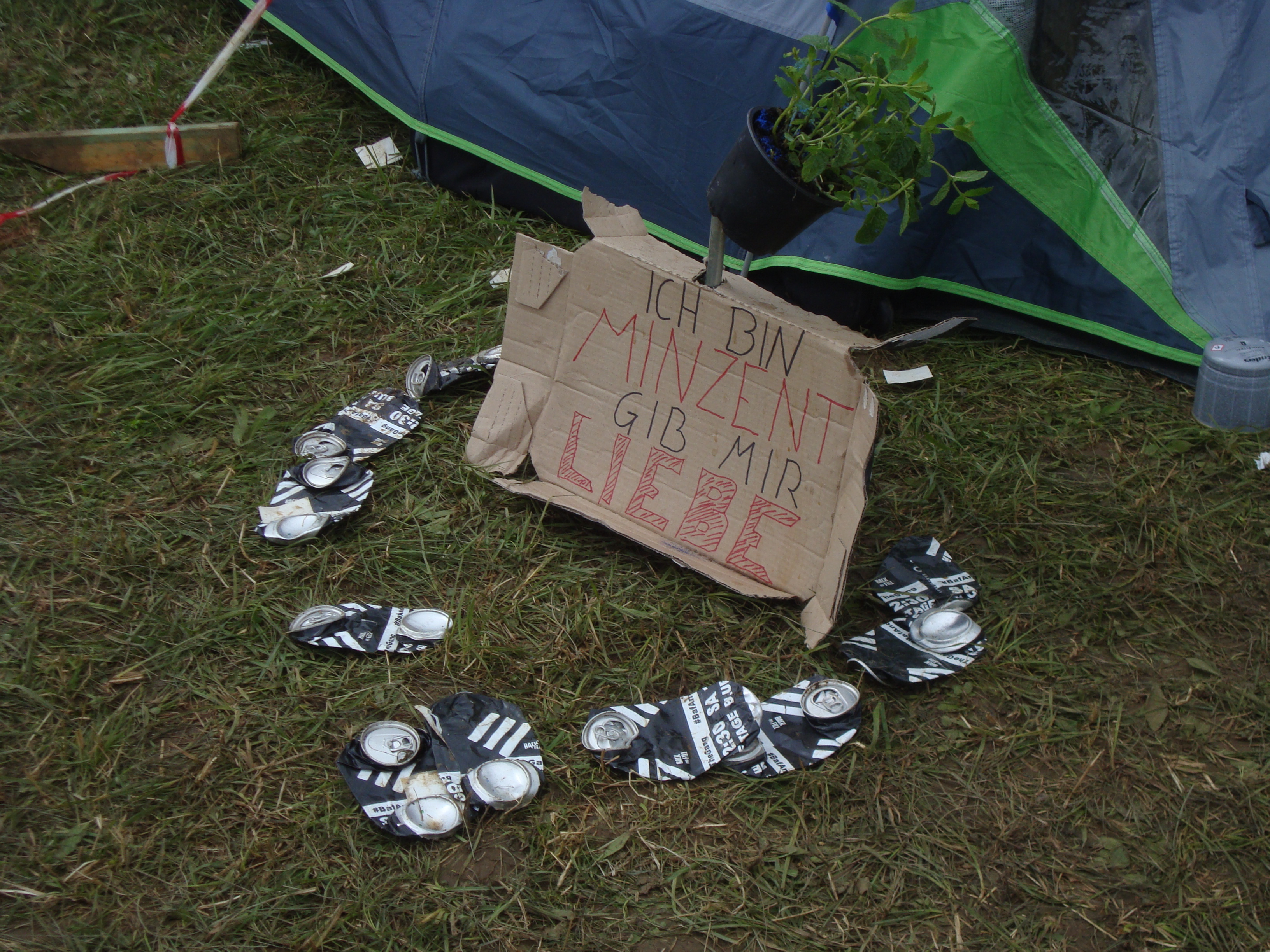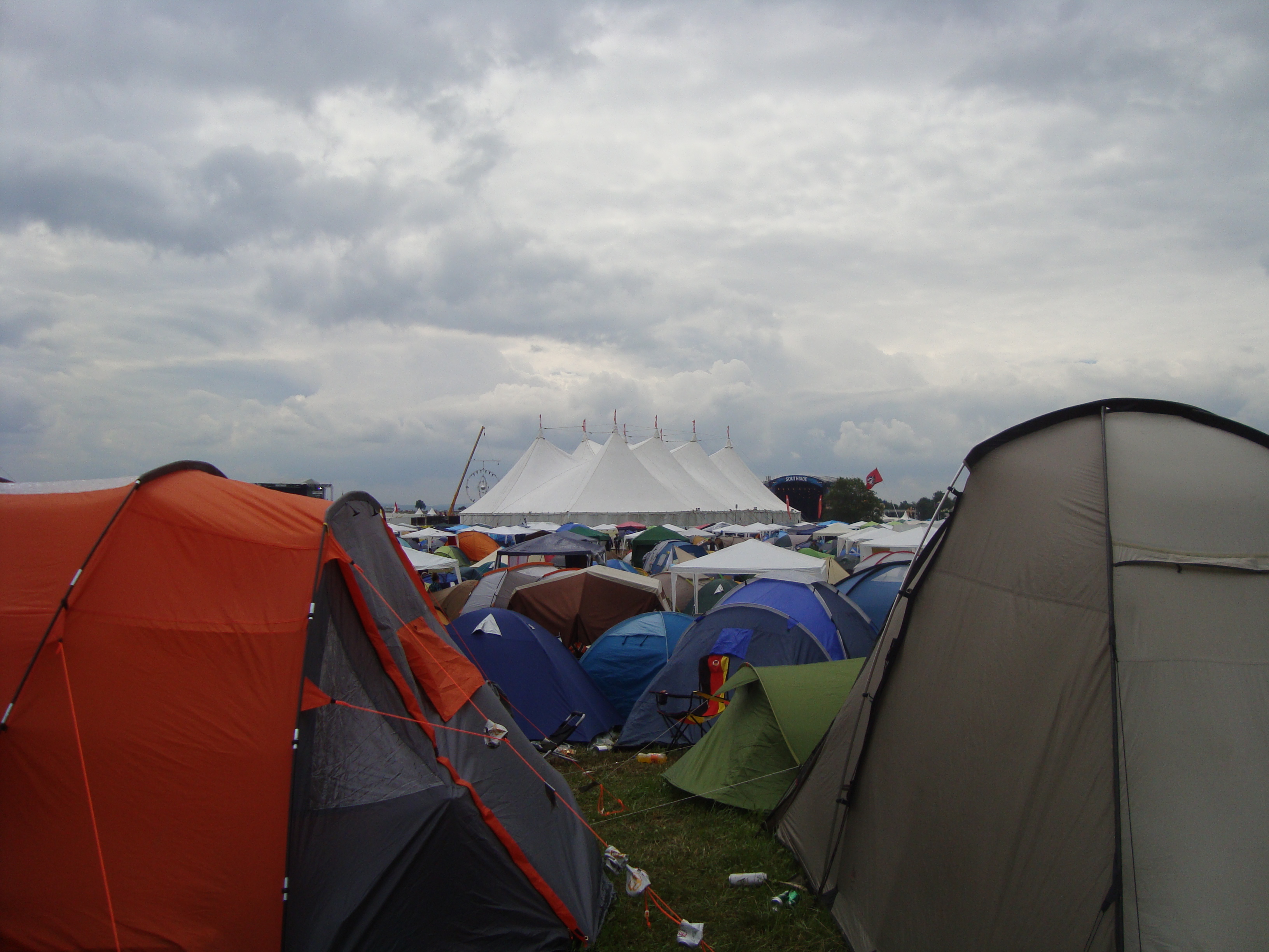 Es fing Donnerstag damit an, dass wir uns im Regen auf machten zum Gelände. Von Konstanz aus ist es ja nicht weit, aber schon auf dem Weg dahin fing es an zu nieseln und auch heftiger zu regnen. Dort angekommen bekamen wir natürlich den Parkplatz, der am weitesten vom Eingang weg war. Aufhören zu regnen wollte es auch nicht. Aber es half ja alles nichts, zelten mussten wir trotzdem. Nach einem Gewaltmarsch durch Matsch und vorbei an längst feiernden Festivalbesuchern fanden wir dann auch irgendwann Platz. Der Platz war super gelegen zum Festivaleingang hin, aber natürlich nicht zum Parkplatz, der war fast eine Stunde weg, wenn man Hin- und Rückweg betrachtete.