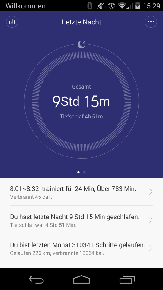 Fazit: Alles in allem eine App, die tut, was sie tun soll und dazu optisch auch noch nett aussieht: Schritte anzeigen und ein paar nette Auswertungen bereitstellen, falls man sich aggregierter oder detaillierter Statistiken anzeigen lassen möchte. Ich nutze sie im Grunde 90% der Zeit nur dafür, die aktuelle Schrittanzahl zu sehen, mir die Grafik der letzten Nacht anzuschauen, den Alarm einzustellen oder den Akkustand anzuzeigen. Alles andere sind für mich nur zusätzliche, nette Spielereien.