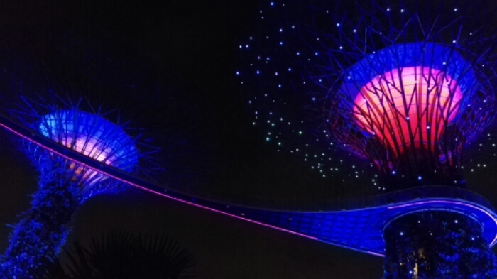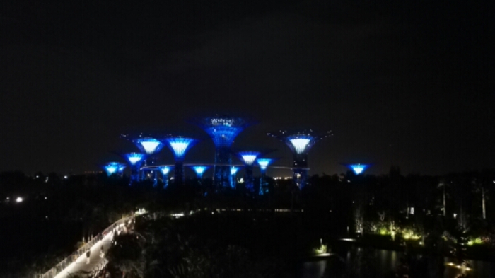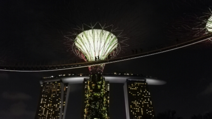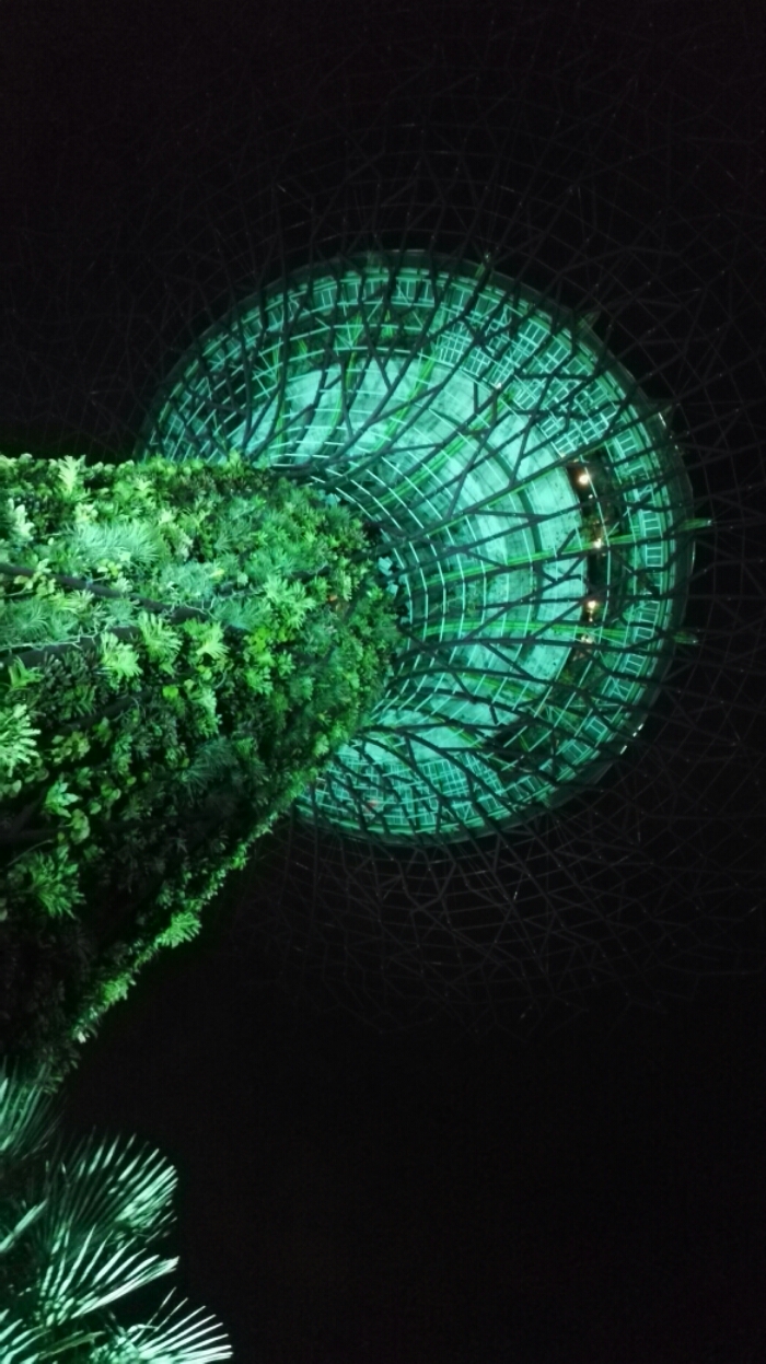Auf dem Weg dort hin gabelten wir noch ein amerikanisches Ehepaar auf, das auch bei dem Couchsurfing-Treffen dabei war. Zusammen ging es zu den Gärten und schon von weitem kann man die beleuchteten, bis zu 50 Meter hohen Bäume schon sehen. Sehr beeindruckend und futuristisch anzusehen.