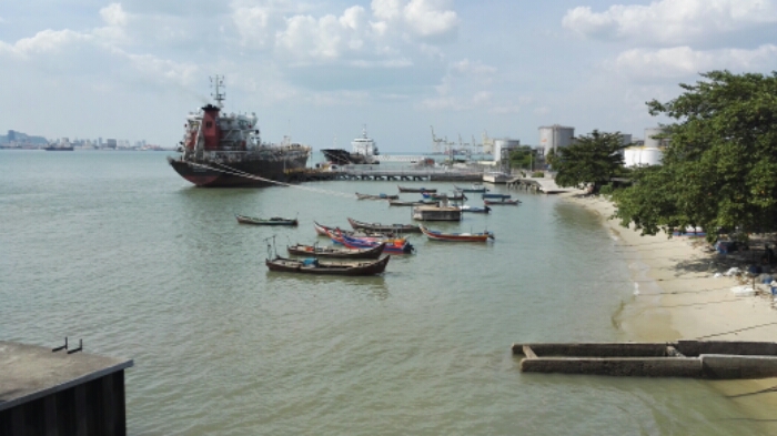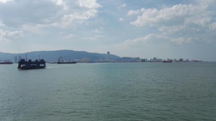 Irgendwann sah man dann schon eine größere Stadt am Horizont – Butterworth, an der Westküste von Malaysia. Von dort wollte ich mit der Fähre nach Georgetown fahren. Ich stieg also aus, lief die paar Meter, musste noch Münzen tauschen um die Fähre zu bezahlen und schon war ich drauf. Die Überfahrt geht ziemlich schnell aber man hat gleich einen schönen Blick auf die Stadt.