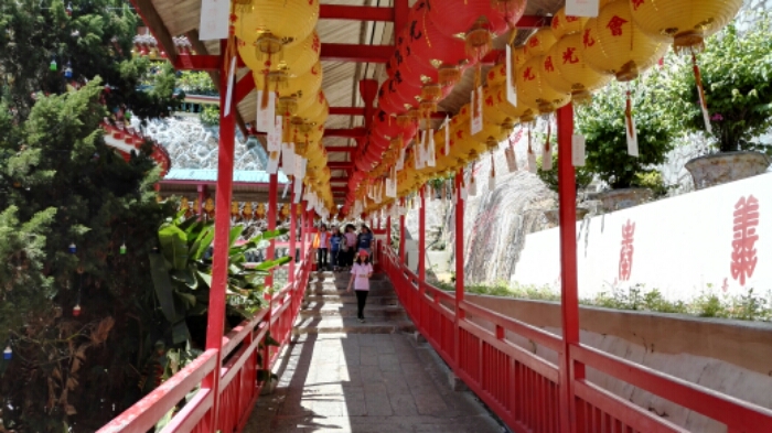 Man läuft durch Souvenirläden zum Tempel, der etwas verwirrend aufgebaut ist. Es gibt verschiedenste Wege und einiges zu sehen, da der Tempel selbst chinesische, aber auch thailändische und indische Einflüsse hat. Immer wieder stößt man auf Grünflächen und Treppen, die wieder zu einer anderen Ebene führen.